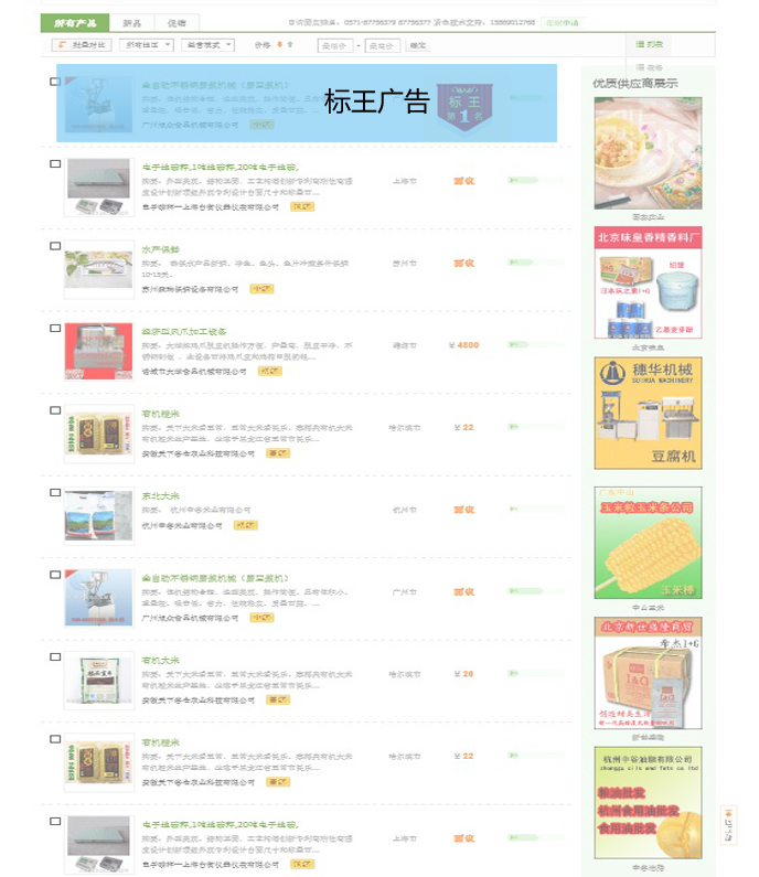 食品生意網(wǎng)作為食品行業(yè)專業(yè)網(wǎng)絡(luò)媒體,已經(jīng)成為了越來越多企業(yè)非常重要的網(wǎng)絡(luò)宣傳平臺(tái),尤其是食品生意網(wǎng)的首頁圖片廣告已成為一個(gè)企業(yè)實(shí)力的象征,可以非常顯著的提升企業(yè)形象、企業(yè)品牌和知名度,備受業(yè)界同行的關(guān)注,為企業(yè)帶來良好的社會(huì)效益和經(jīng)濟(jì)效益。